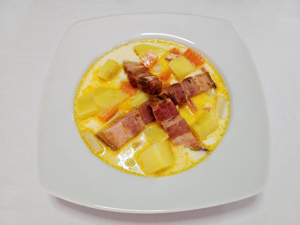 Ingrediente: ceapă, morcovi, țelină, păstârnac / pătrunjel rădăcină, cartofi, afumătură, smântână, ou, ulei, condimente