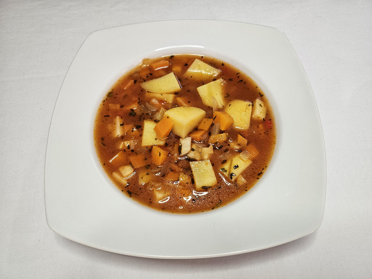 Ingrediente: ceapă, morcovi, țelină, păstârnac / pătrunjel rădăcină, cartofi, bulion, ulei, condimente