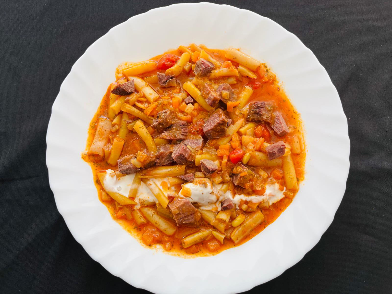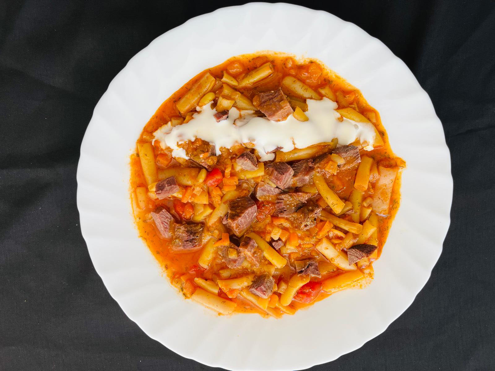 Ingrediente: carne de porc, fasole verde / galbenă, morcovi, ceapă, roșii cuburi, ulei floarea soarelui, condimente