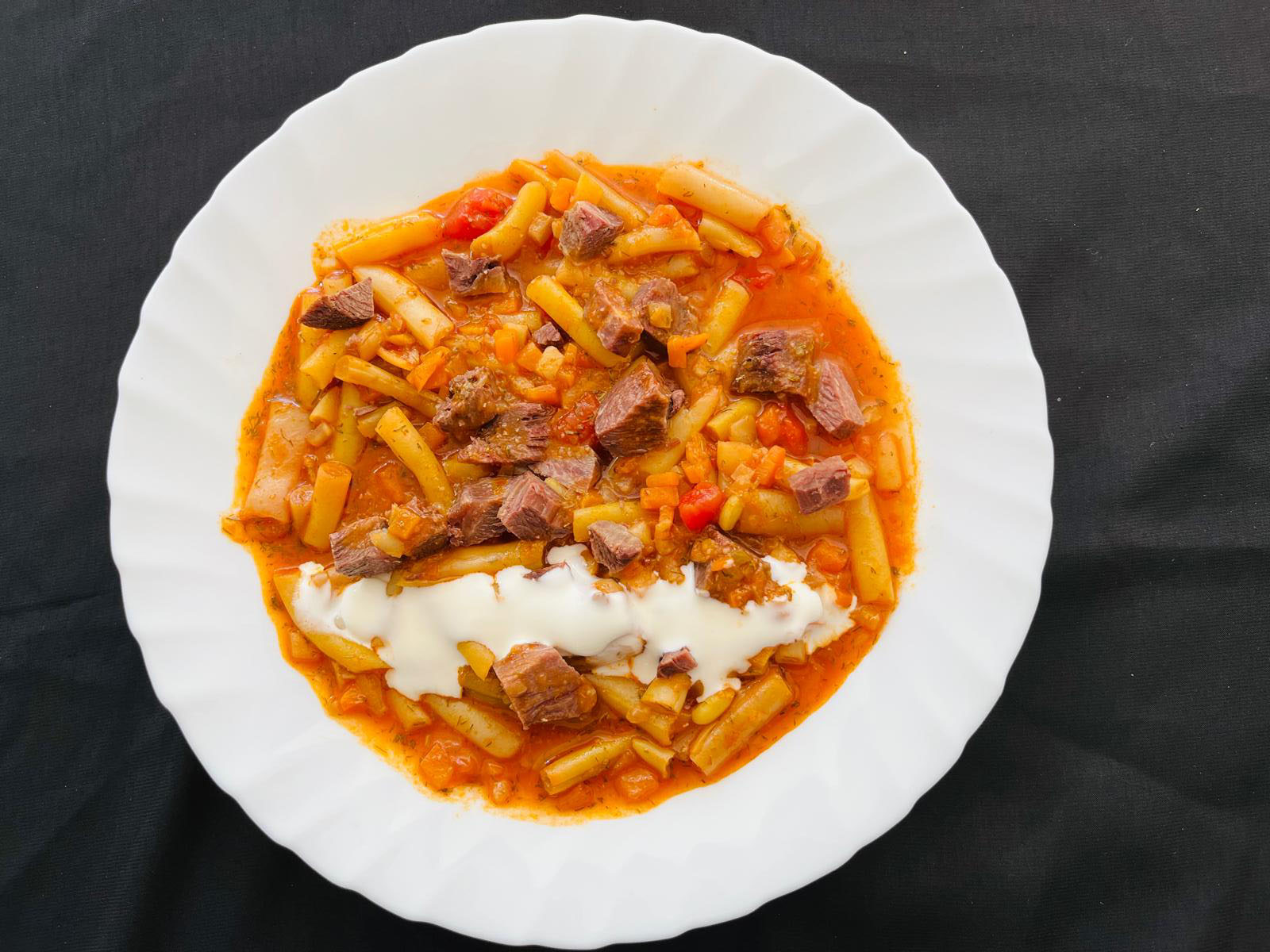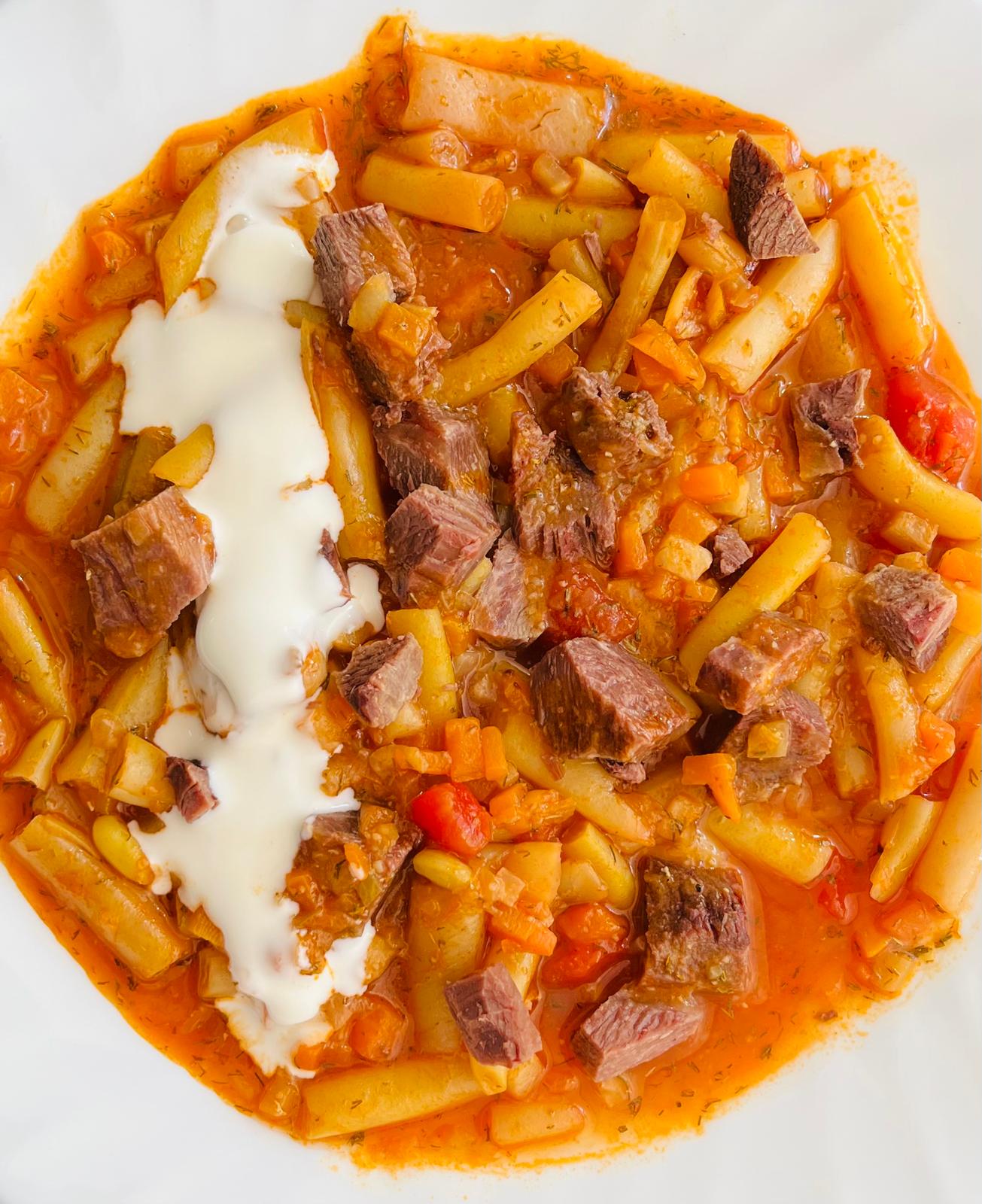 Ingrediente: carne de vită, fasole verde / galbenă, morcovi, ceapă, roșii cuburi, ulei floarea soarelui, condimente
